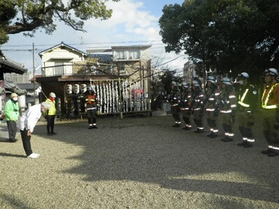 本訓練は、神社拝殿で火災が発生した際の、自衛消防隊の初期消火及び境内参拝者の避難誘導要領、公設消防隊との連携に重きを置いた訓練を実施しました。