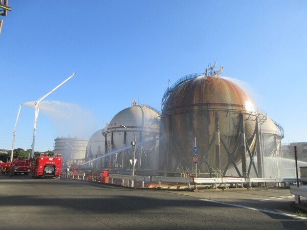 本訓練では、球形タンク下部配管からLPGの漏洩・火災が発生したときのBLEVE(ブレビー・液体の急激な気化による爆発現象)を起こさせないための冷却放水の実施および水注入による漏洩停止作業についての確認を実施しました。