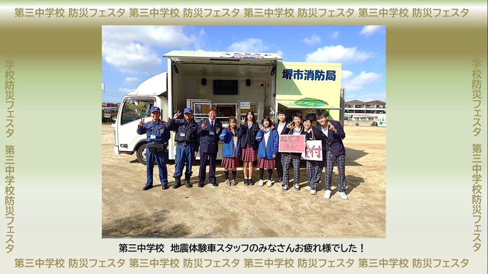 秋晴れの11月15日(土曜)、大阪狭山消防署は、第三中学校で実施された防災フェスタに、地震体験車で参加しました。