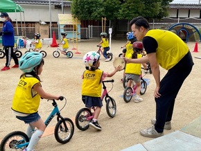 キックバイクを使い、遊びながら自転車のバランス感覚や交通ルール、空間認識能力や協調性が学べる自転車教室を実施しました。
