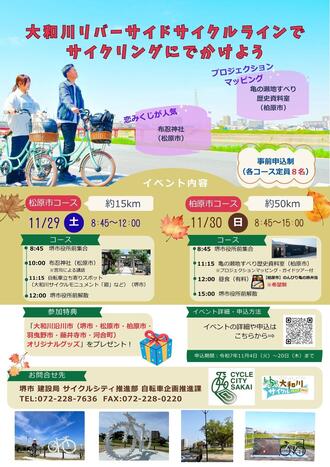 堺市では、大和川沿川自治体と連携し、大和川リバーサイドサイクルラインで行くサイクリングイベントを実施します。この機会に自転車でお出かけしませんか。参加者には素敵な特典もご用意しています!
