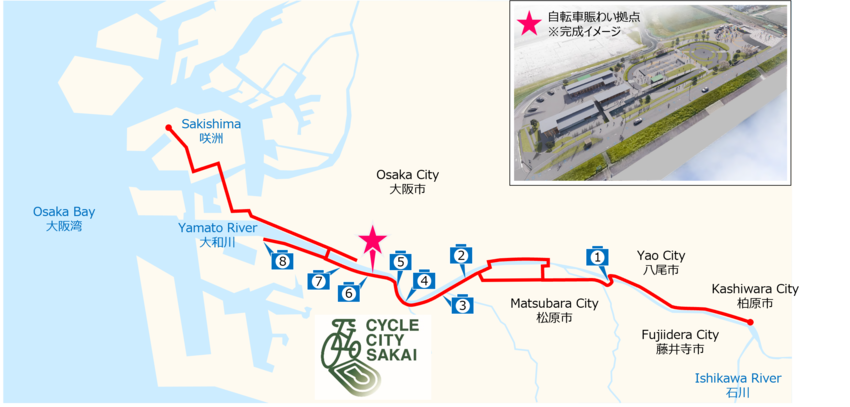 大和川沿いの自然や景観を楽しめる約25キロメートルのサイクルラインで、咲洲と堺・南河内地域を結び、南河内地域から奈良方面に通じる石川リバーサイドサイクルラインや泉州地域から和歌山方面に通じる大阪ベイサイドサイクルラインと接続しています。堺市区間は約8キロメートルで、阪神高速道路大和川線事業や高規格堤防事業によって生み出された敷地を有効活用して安全で快適な自転車通行空間を整備しました。日常利用やサイクリングなどにぜひご活用ください。