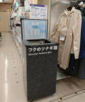 「みんな微笑む「すてない」未来へ」をめざす「サステナブルファッション・プラットフォーム協議会」に参加し、「服のツナギ箱」という回収ボックスを設置しています。回収された⾐類は、協⼒会社(ファイバーシ―ディーエム株式会社)に送られ、選別され、リユースやリサイクルなどの最適な⽅法にまわされます。 |