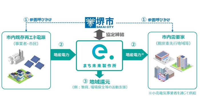 (3)株式会社まち未来製作所は得られた収益の一部を堺市と協議の上、地域活性化に向けた取組に活用することで、堺市の脱炭素先行地域のテーマである「脱炭素と地域課題の同時解決」につなげます。