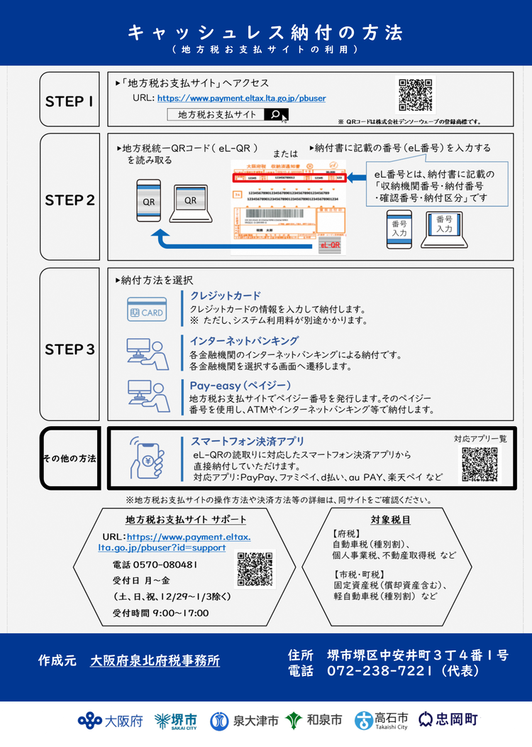 堺市では大阪国税局や金融機関や関西の自治体とともに「キャッシュレス納付推進共同宣言」に参加し、市税のキャッシュレス納付を推進しています。