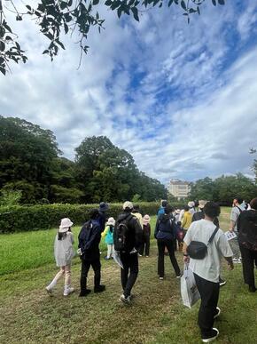 当日は、みはら歴史博物館に集合し、史跡黒姫山古墳歴史の広場ガイダンス施設を通って稲刈り会場に向かいます。会場に向かうまでの間は、堺市世界遺産課による「黒姫山古墳ガイドツアー」にも参加していただきました。