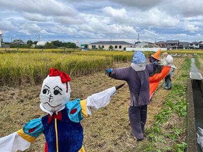 参加者が作業しやすいように、田んぼはスタッフが事前に整備しています。今年は手作りかかし5体も田んぼに並び、「初めて見た!」とこどもたちにも大人気でした。