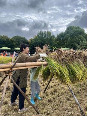 「昔ながらの稲刈り体験」ということで、束ねた稲は「稲架掛け(はざかけ)」という方法で乾燥させます。手が届かない小さなこどもも、スタッフのサポートを受けながら、楽しそうに稲を掛けていました。