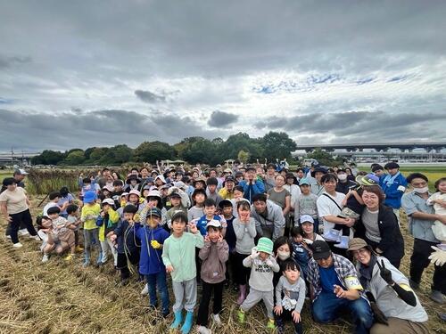10月19日(日曜)、黒姫山古墳近くの田んぼで「古代米プロジェクト昔ながらの稲刈り体験イベント」を行いました。今回は、124人の当選者とスタッフを合わせると約160人の方々に参加いただきました。