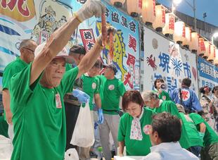 夜市当日は、メンバー全員が揃いの緑色シャツを着て気合十分です。鮮やかな色のためか遠くからも目立っていて、他の団体からも「美原区いいね!」と声をかけられ嬉しかったです。