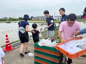 田んぼでの作業終了後には、スタッフから参加者に対して、お米ができるまでを分かりやすく説明しました。