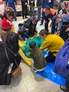 ステージ上では、親子で楽しめるサイエンスショーや堺市消防音楽隊の迫力ある演奏などがあり、大いに盛り上がっていました。AED・胸骨圧迫体験や防災グッズクイズコーナー、毛布で担架タイムトライアル、子ども消防士体験などには長い列ができており、たくさんの方が親子で参加されていました。1月1日の能登半島地震後ということもあり、更に真剣な眼差しで取り組まれているように感じました。