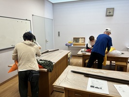 M・Cみはらの体験工房室でかかしを作りました。木材で骨格を作り、段ボールや藁などで、肉付けし、服を着せて、最期に顔を書きました。