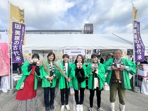 お揃いの法被を着て、お客様の呼び込みや古代米、ドライフラワーの販売を行いました。