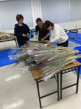 乾燥したドライフラワーの薬品(クエン酸液・重曹液)処理を行いました。薬品に浸けることで、稲の発色を良くし、色落ちしにくくします。稲穂を浸けた後は、再度乾燥させるために、稲穂を干しました。
