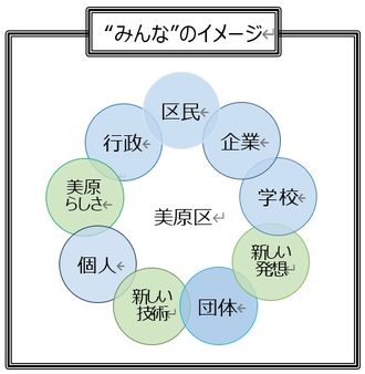 わたしたちは、区民、行政、企業、学校、団体、個人や培ってきた美原らしさ、新しい発想や技術等とつながり合えるような、“みんな”が架け橋になる美原区を築きます。
