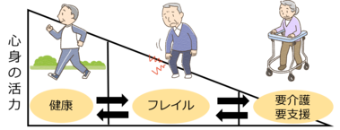 フレイルとは、加齢と共に心身の活力(身体的機能や認知機能など)の低下がみられる状態のことです。