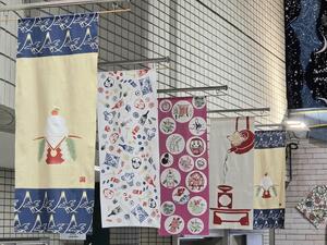 中区役所1階エントランスホールで注染手ぬぐいを展示しています。