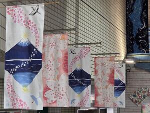 4月は華やかな桜と雄大な富士山が湖面に映る、日本らしさが感じられる注染と、春を彩る桜柄の注染です。ご来庁の際はぜひご覧ください。