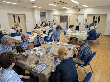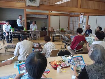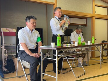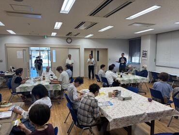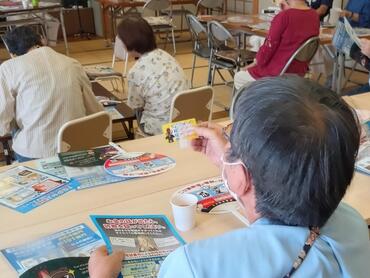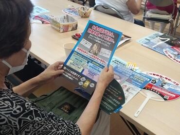 土師校区のふれあい喫茶に訪問し、中堺警察署と一緒に特殊詐欺被害防止の啓発を行いました。参加された皆様に、最近の被害傾向や被害防止の取組である「さかい運動」についてご紹介させていただきました。