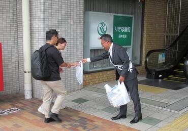 5月26日から5月31日までの間、浪華本染め<注染>WEEKを開催しました。中区役所1階エントランスホールで葛飾北斎の作品を染めた手ぬぐいや反物などの展示、5月30日からは手ぬぐいやガーゼハンカチなどの製品販売を行いました。