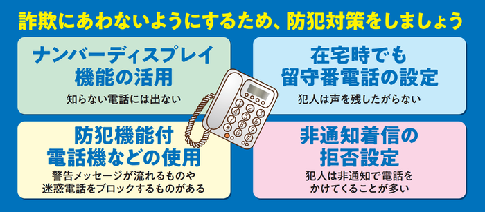 詐欺に遭わないようにするため、固定電話の防犯対策をしましょう。