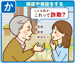 お金の話が出たら詐欺を疑い、ご家族やご友人、警察などの相談窓口に確認や相談をしましょう。