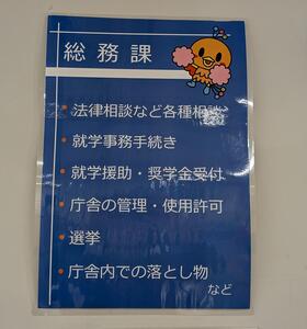 総務課の窓口がわかりにくいとの声があったため、総務課の案内の張り紙をカラーで設置しました。