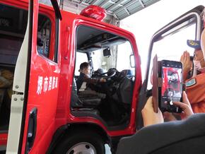 大きな消防車に乗って記念撮影!
