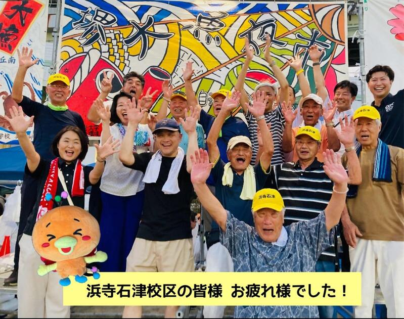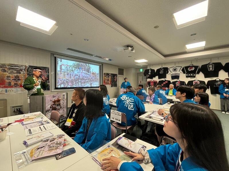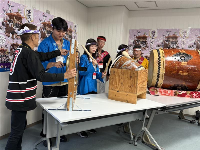 10月5日には祭礼連合や自治連合会の皆様のご協力により西区だんじりパレードに約40人の留学生をお招きし、西区に受け継がれる伝統文化を紹介する国際交流を行いました。各町からお借りした法被を羽織り、鉢巻きの巻き方や意味を教えていただいたり、太鼓や鐘など鳴り物を体験したり盛り上がりました。だんじりを間近で見学させていただき青年団の方との交流も生まれていました。