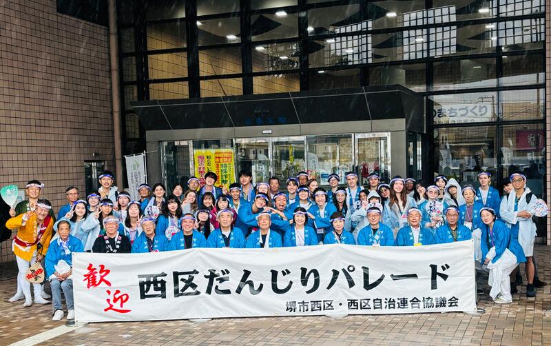 10月5日には祭礼連合や自治連合会の皆様のご協力により西区だんじりパレードに約40人の留学生をお招きし、西区に受け継がれる伝統文化を紹介する国際交流を行いました。各町からお借りした法被を羽織り、鉢巻きの巻き方や意味を教えていただいたり、太鼓や鐘など鳴り物を体験したり盛り上がりました。だんじりを間近で見学させていただき青年団の方との交流も生まれていました。