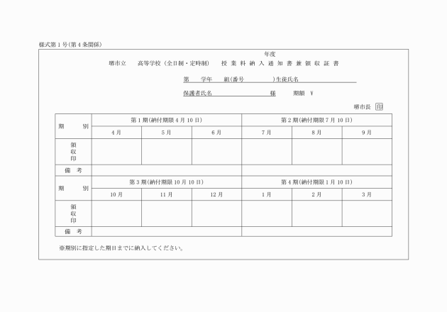 2 授業料は、授業料納入通知書兼領収証書(様式第1号)により徴収するものとする。ただし、生徒から申出があったときは、授業料を自動払込み(郵政民営化法(平成17年法律第97号)第94条に規定する郵便貯金銀行による自動払込みをいう。)の方法により徴収することができる。