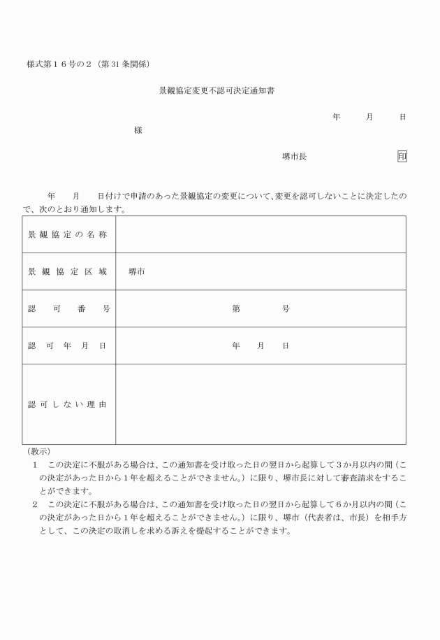 第35条 法第90条第2項の規定により景観協定の認可を受けた者は、同条第1項に規定する景観協定区域内の土地に2以上の土地所有者等が存することとなったときは、景観協定発効届出書(様式第21号)を市長に提出しなければならない。