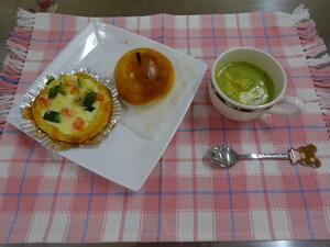 もう1品、小松菜を使ったポタージュを作り、パンが焼きあがったら完成です。