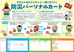 災害は突然起こります。家族と一緒にいる時とは限りません。「防災パーソナルカード」は、いざという時に備えて、名前や連絡先、避難場所などをまとめておくカードです。家族や周囲の人と話し合ってカードを1人1枚作成し、いつも持ち歩きましょう。