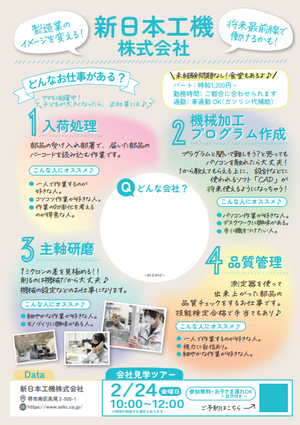 感想 | ・職種からは難しそうと想像される仕事も見学することでハードルが下がり採用につなげることができた。 ・出産後も働けて、その後も長く働ける環境をPRできた。・今回の採用の他にも女性が活躍できる職場は多くあり、この取り組みを今後も継続することで、地域の方にもっと認知してもらう企業を目指したい。 |