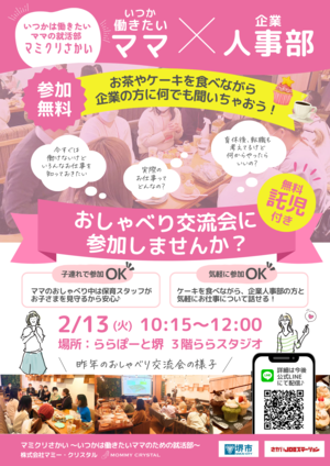 取組内容 | ・ママが働く時の大きな課題の一つが時間。「定時」や求人票の就業時間だけを見て諦める人が多い現状を伝えた。先輩ママの就業時間調整を例に勤務時間について柔軟な対応をしてもらえる好事例をママたちにアピール。 |