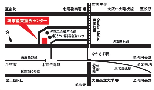- 駐車場は、堺市産業振興センター隣接の来客用駐車場(無料)がありますが、できるだけ電車、バスなどの公共交通機関を利用してください