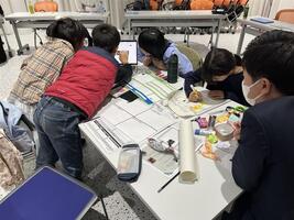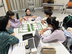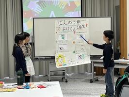 迎えた9月15日(月・祝)の万博イベント当日、こどもたちは4人ずつ4グループに分かれ、それぞれ1時間半、来場者に対して自ら製作した作品の説明や体験サポートを行いました。初めての発表に緊張しながらも、積極的に説明する姿が見られ、保護者からは「成長を実感した」という声が寄せられました。