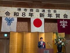 令和8年堺市商店連合会新年賀会が開催され、堺市議会を代表して西田議長と西川副議長が出席しました。