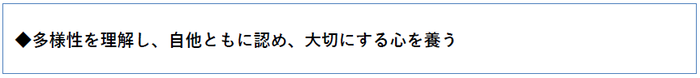 こどもたちがともに成長するため、自尊心を高め自らを理解することで多様性を理解し、他者にも思いやりを持つことができる取組を推進します。