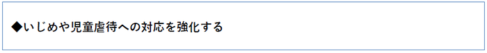 こどもの健やかな成長を支えるため、心身に重大な影響を与えるいじめや児童虐待を許さない強い姿勢で臨みます。校長がリーダーシップを発揮し、学校全体として組織的に対応します。あわせて相談機能を充実・強化し、市長部局や教育委員会、地域、警察、弁護士などが強固な連携のもと、それぞれが持つ専門知識やネットワークなどを活用していじめや児童虐待の未然防止、早期発見、早期対応に積極的に取り組み、早期解決を図ります。
