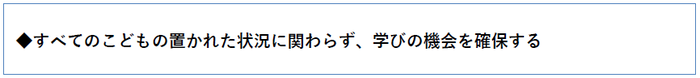 障害の有無や不登校、家庭の経済環境などこどもの状況や取り巻く環境は様々です。すべてのこどもが置かれた状況に関わらず着実に学ぶことができるよう、ICTなどの様々な手段を活用しながら学びの機会を確保します。