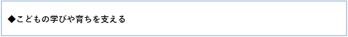 こどもが学校で過ごす時間だけでなく家庭教育や社会教育の場など様々な機会を通じて学び健やかに育つことができるよう、家庭や行政、地域、企業、大学などが協力し、こどもの学びを支える環境を充実します。