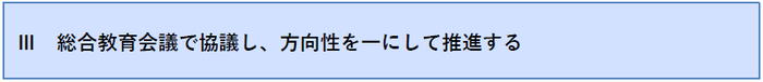 毎年度の総合教育会議において重要方針に掲げる各項目について協議し、認識の共有を図りながら教育委員会と市長部局が方向性を一にして大綱を着実に推進します。教育委員会は総合教育会議で協議した内容が各学校で円滑に実施されるよう、責任を持って必要な支援や指導を行います。