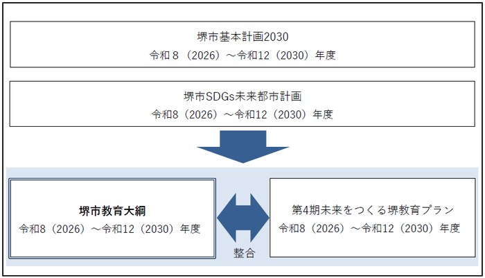 大綱は「堺市基本計画2030」や「堺市SDGs未来都市計画」を踏まえ、教育委員会が策定する「第4期未来をつくる堺教育プラン」と整合するものです。