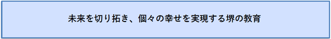 基本理念に掲げる「未来を切り拓き、個々の幸せを実現する堺の教育」には、堺のこどもたちが先行き不透明な時代の中で自ら未来を切り拓くための力を身につけ、それぞれの幸せを実現することができる教育を提供するという強い思いを込めています。