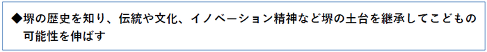 堺は古くから世界と交流し「ものの始まりなんでも堺」と謳われるほどイノベーション精神に溢れ様々な新しいものを生み出してきました。こどもが世界や様々な分野に視野を広げ可能性を伸ばすことができるよう、堺が有する貴重な歴史を学び、伝統や文化、イノベーション精神などの堺の土台を継承します。