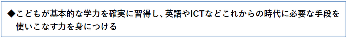 こどもが可能性を最大限発揮するためには自ら考え、自らの将来を創造し、表現する力を身につけることが大事です。学習の基礎となる読解力と集中力、自分の意見や思いを的確に他者に伝える力(表現力)を身につけることができるよう取組を推進します。