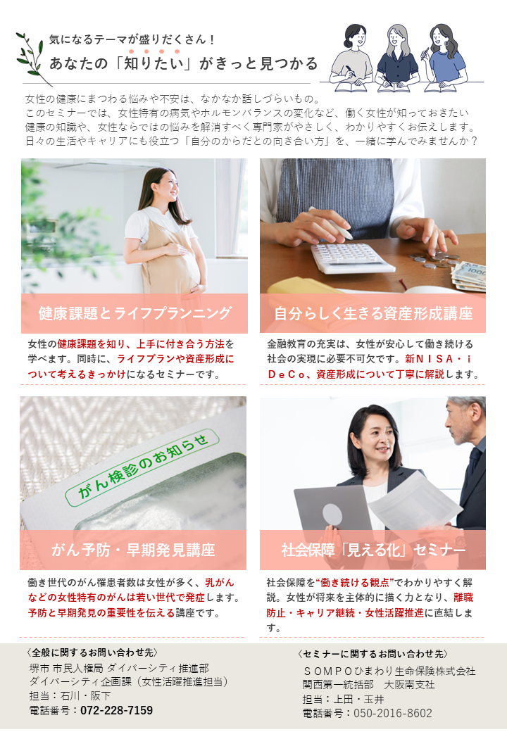 堺市とSOMPOひまわり生命保険株式会社は、女性社員の金融リテラシー向上を支援する企業の取組を後押しするとともに、女性特有の病気のリスクや女性ホルモンとの関係性など、働く女性の健康課題について社員の理解を促進するため、出張セミナーを共催しています。